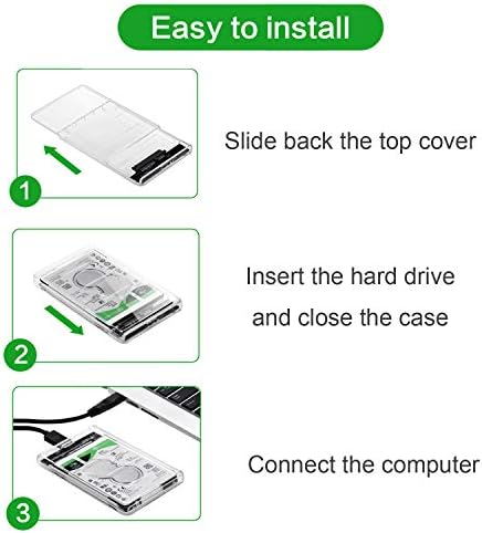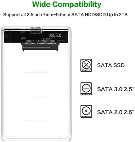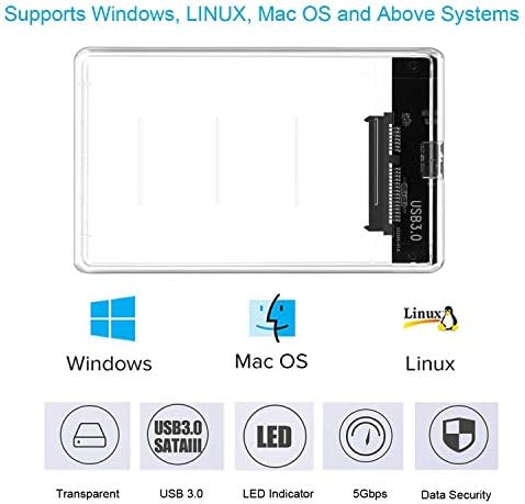 Universal Compatibility: Hard Drive Enclosure supports Windows, LINUX, Mac OS 8.0, and above systems. Specially designed for 2.5 inch HDD and SSD up to 2TB with the thickness of 7mm/9.5mm. Compatible with Western Digital, Seagate, Toshiba, Samsung, Kingston, SanDisk, Crucial, Hitachi, SSD HDD with SATA port