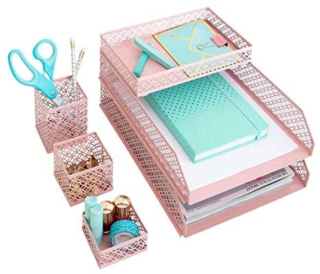 • Blu Monaco Office Supplies Pink Desk Accessories for Women-6 Piece Interlocking Desk Organizer Set- Pen Cup, 3 Assorted Accessory Trays, 2 Letter Trays-Pink Room Decor for Women and Teen Girls